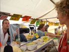 En links onder stappen we uit en lopen de markt op. En dit is het kaas halen.